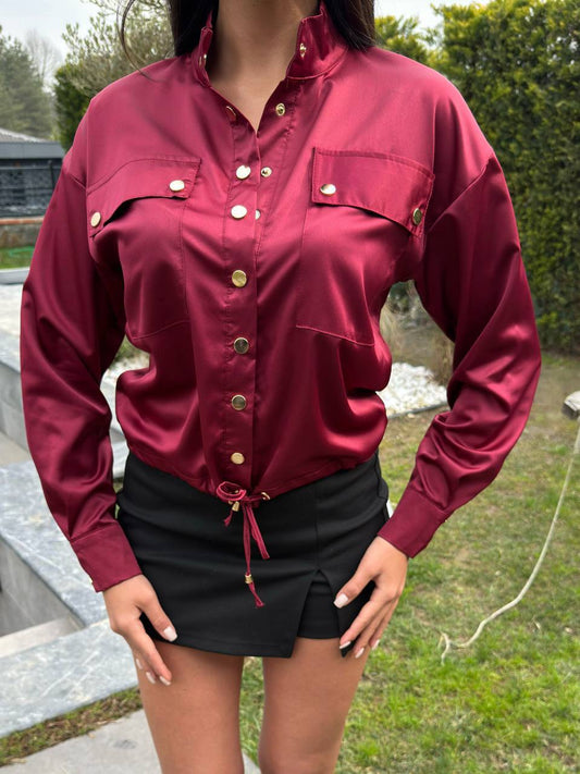 Saten Düğmeli Gömlek Bordo