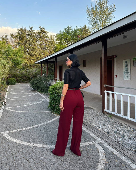 Kemerli Yüksek Bel Bordo Palazzo Pantolon