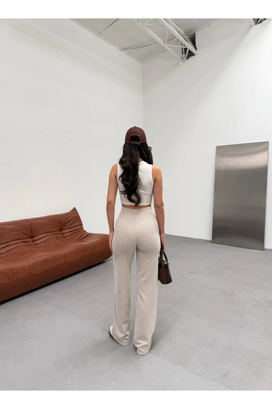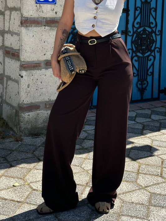 Kemerli Yüksek Bel Kahverengi Palazzo Pantolon
