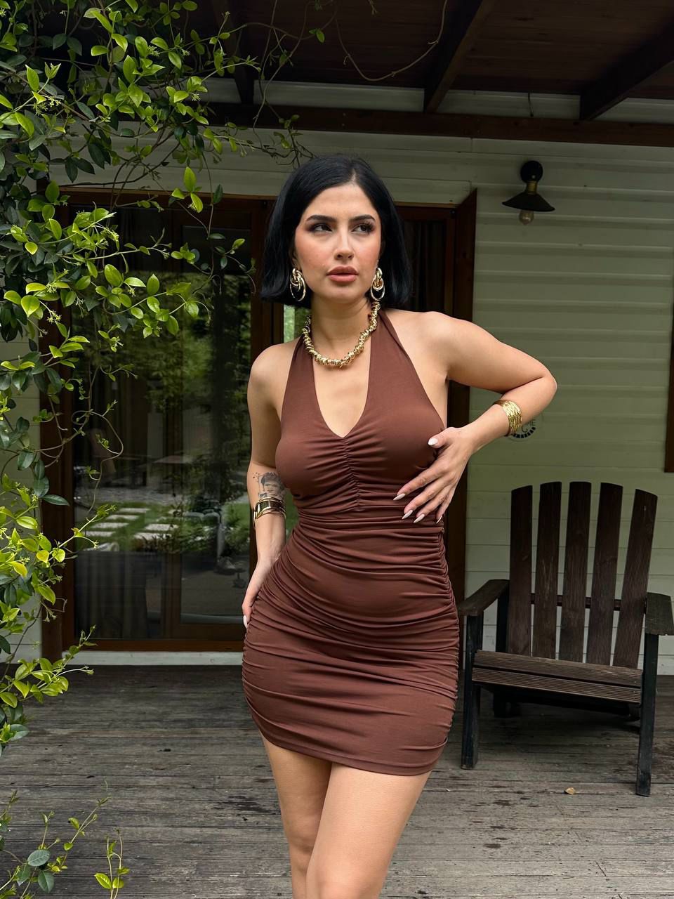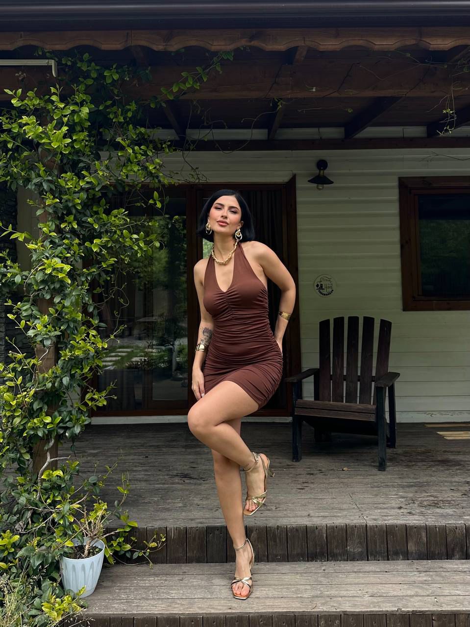 Boyundan Bağlamalı Mini Büzgülü Elbise