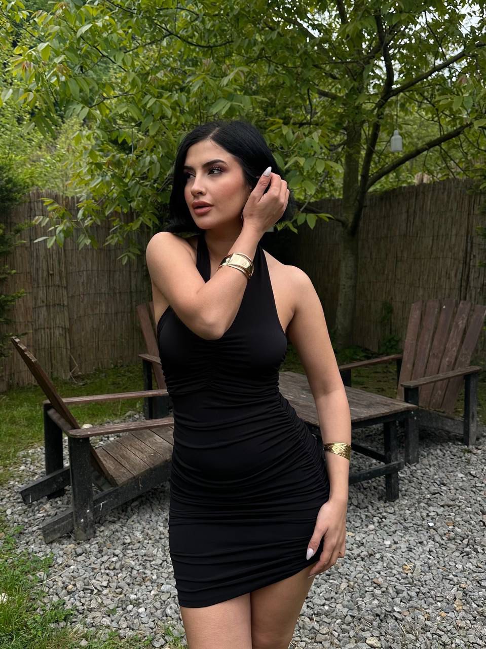 Boyundan Bağlamalı Mini Büzgülü Elbise