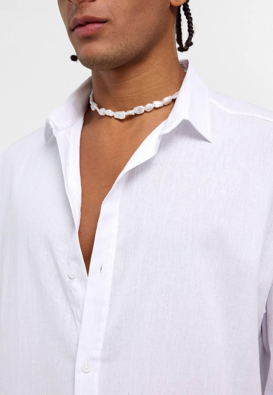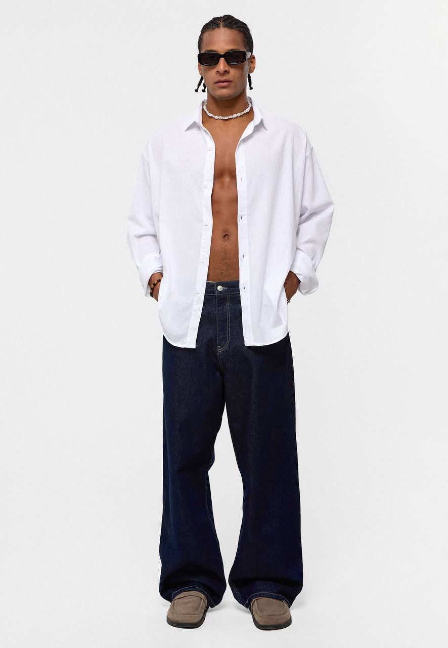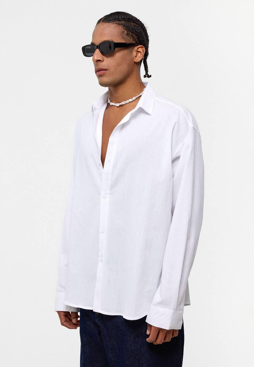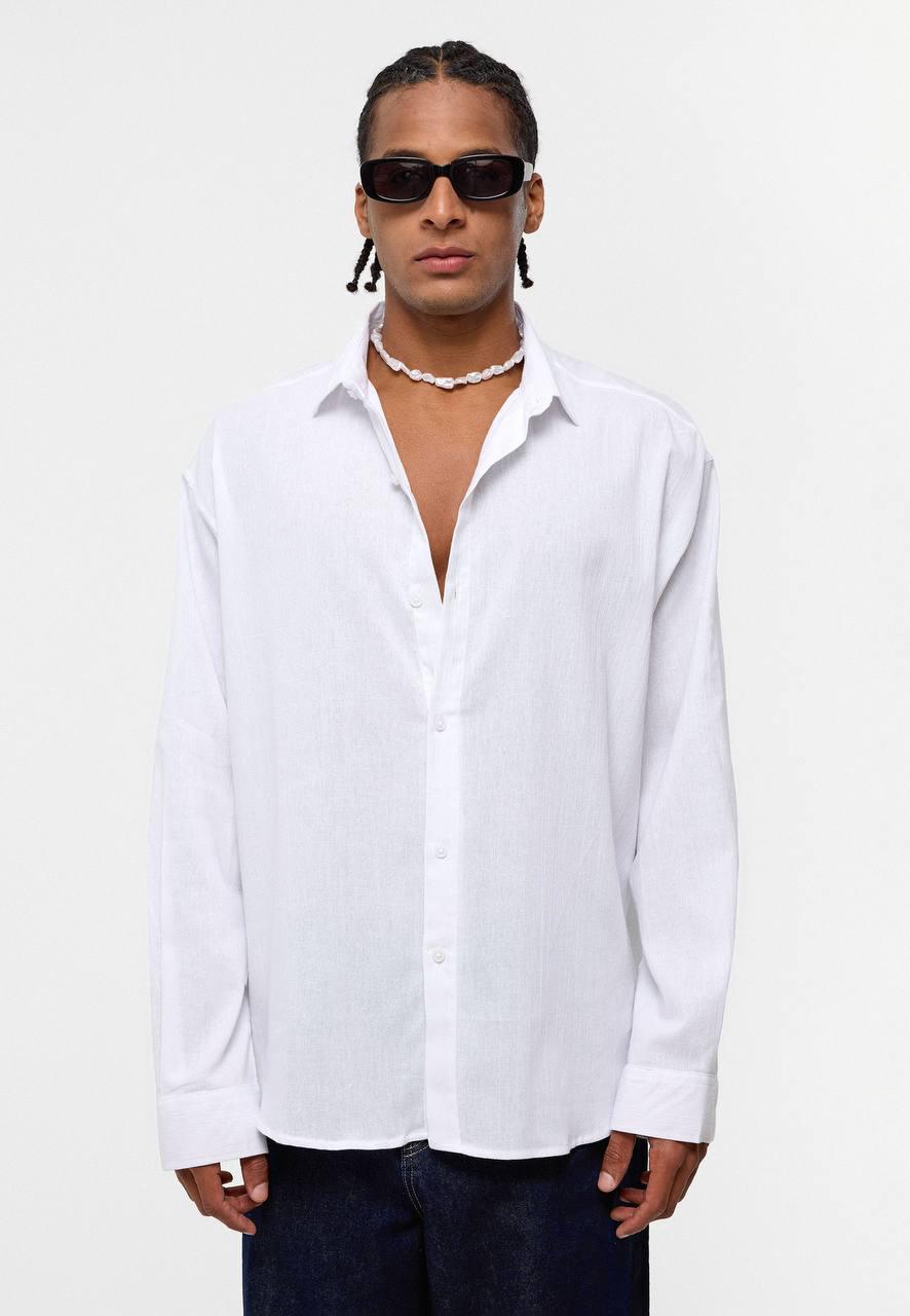 Beyaz erkek gömlek, yazlık erkek gömlek, oversize keten gömlek, erkek yaz modası 2025, rahat ve şık erkek gömlek.