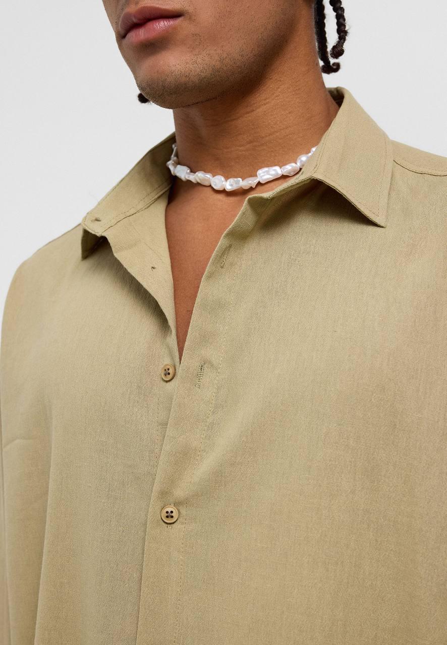 Haki erkek gömlek, yazlık oversize gömlek, keten görünümlü gömlek, rahat erkek yazlık gömlek, erkek salaş gömlek, 2025 yaz erkek modası.