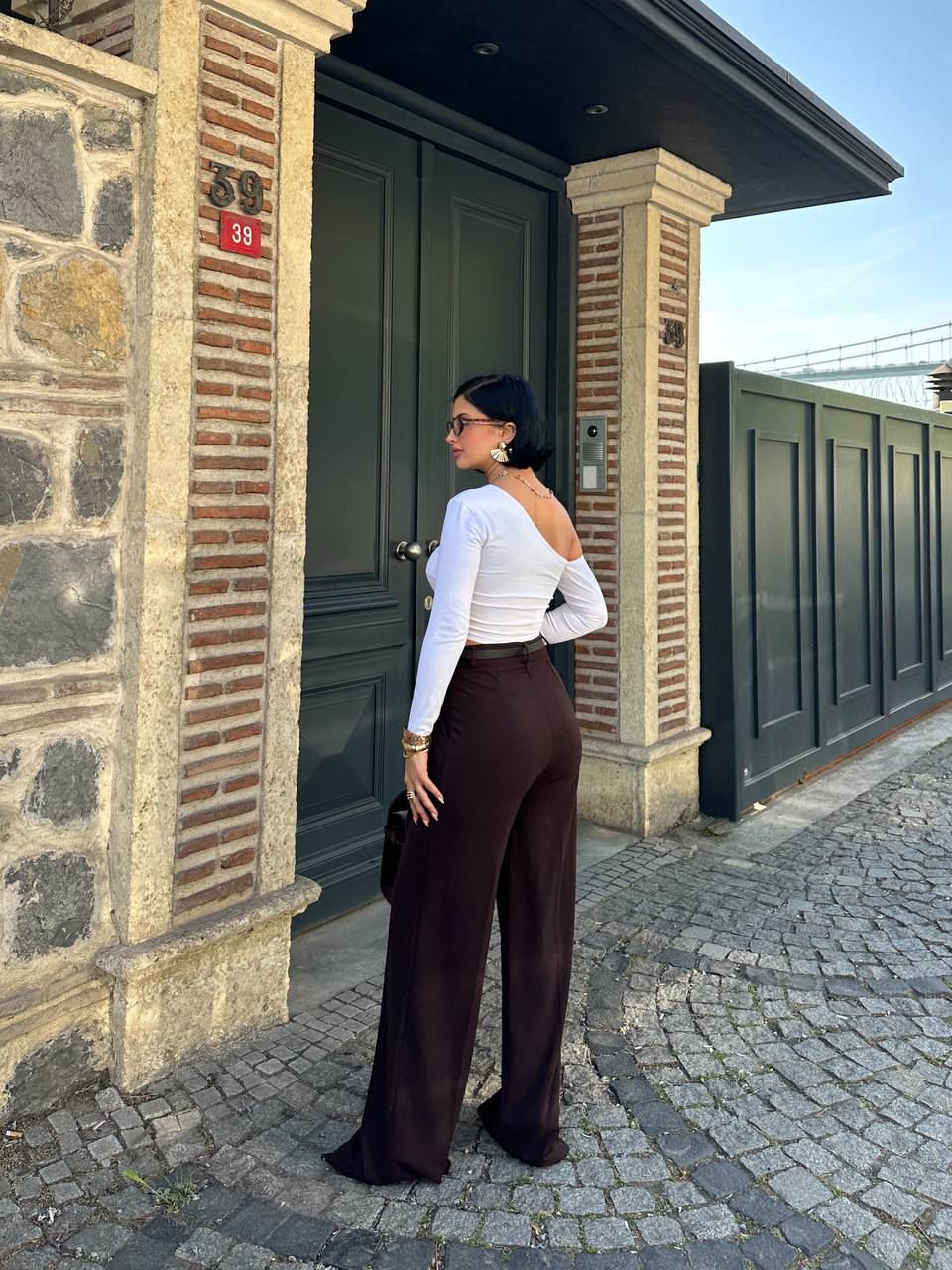 kahverengi palazzo pantolon, kemerli kadın pantolon, yüksek bel ofis kombini