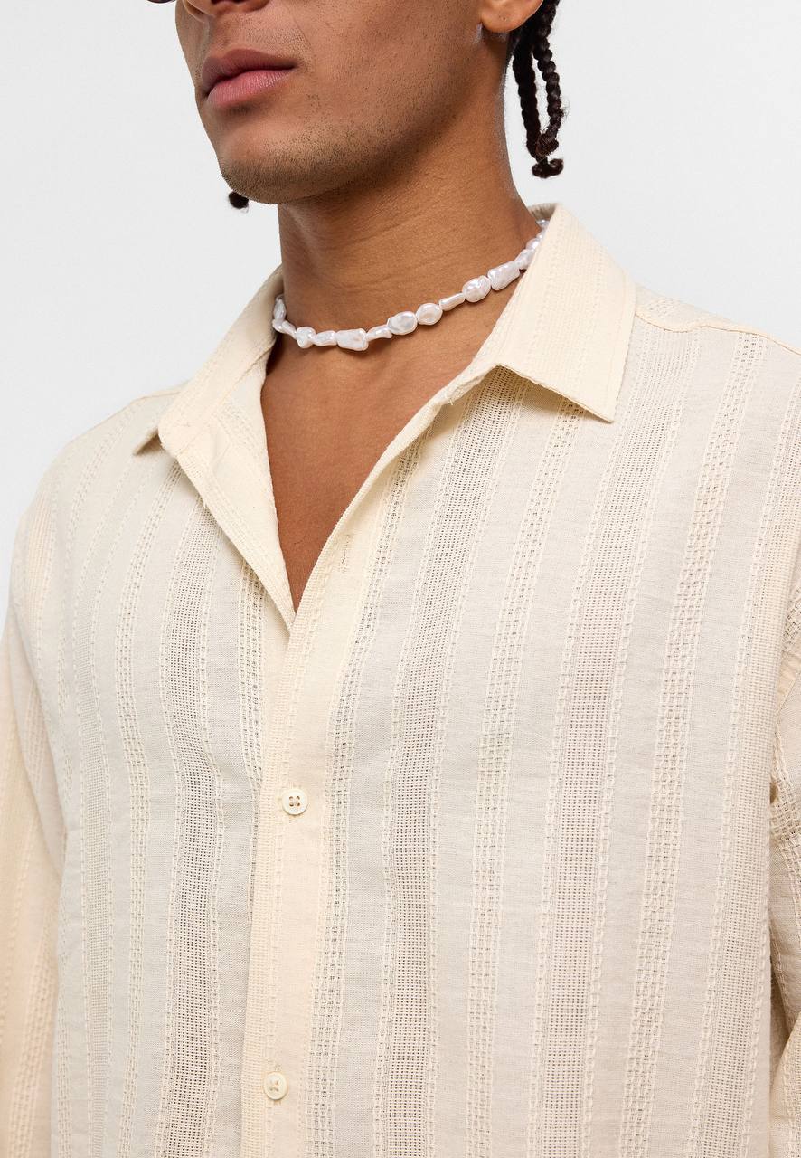 Krem keten gömlek erkek , oversize yazlık gömlek , erkek şerit detaylı gömlek , nefes alan erkek gömlek , yazlık beyaz gömlek 2025