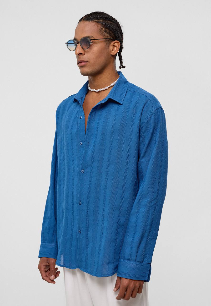 Oversize Şerit Detaylı Erkek Mavi Gömlek EOL-15525