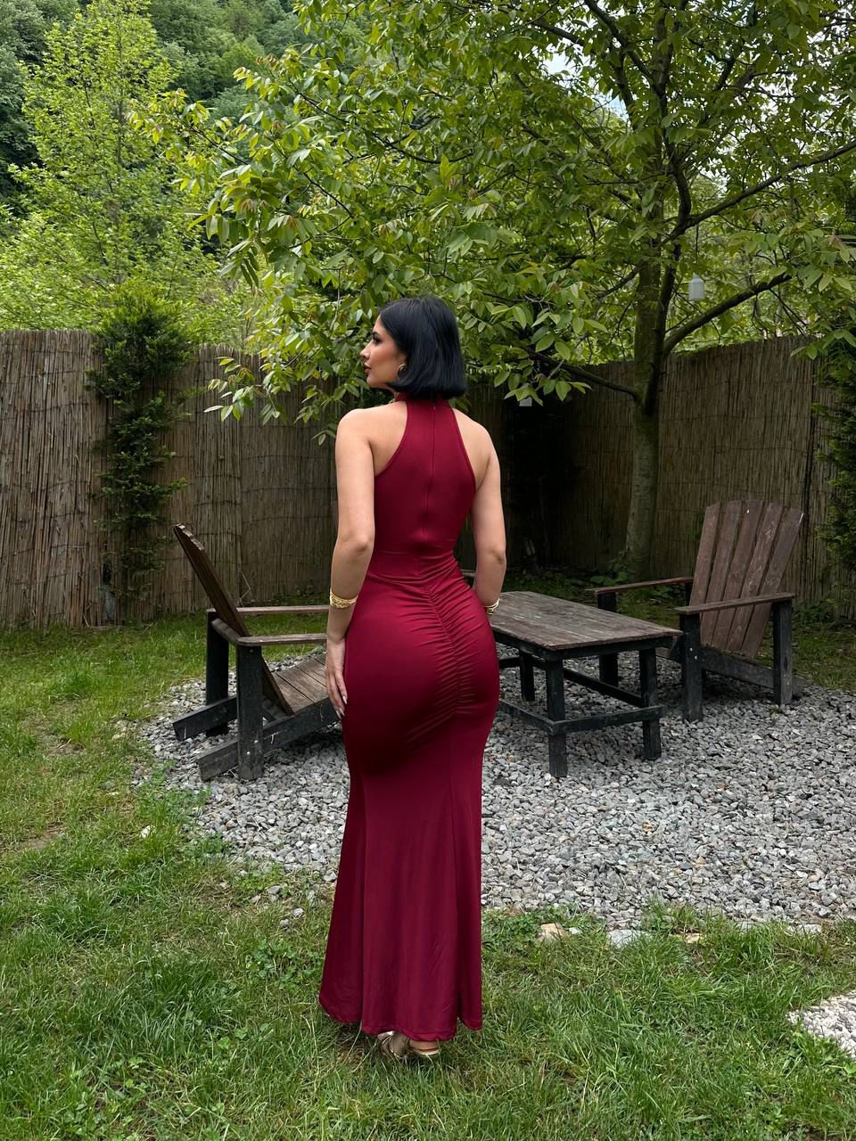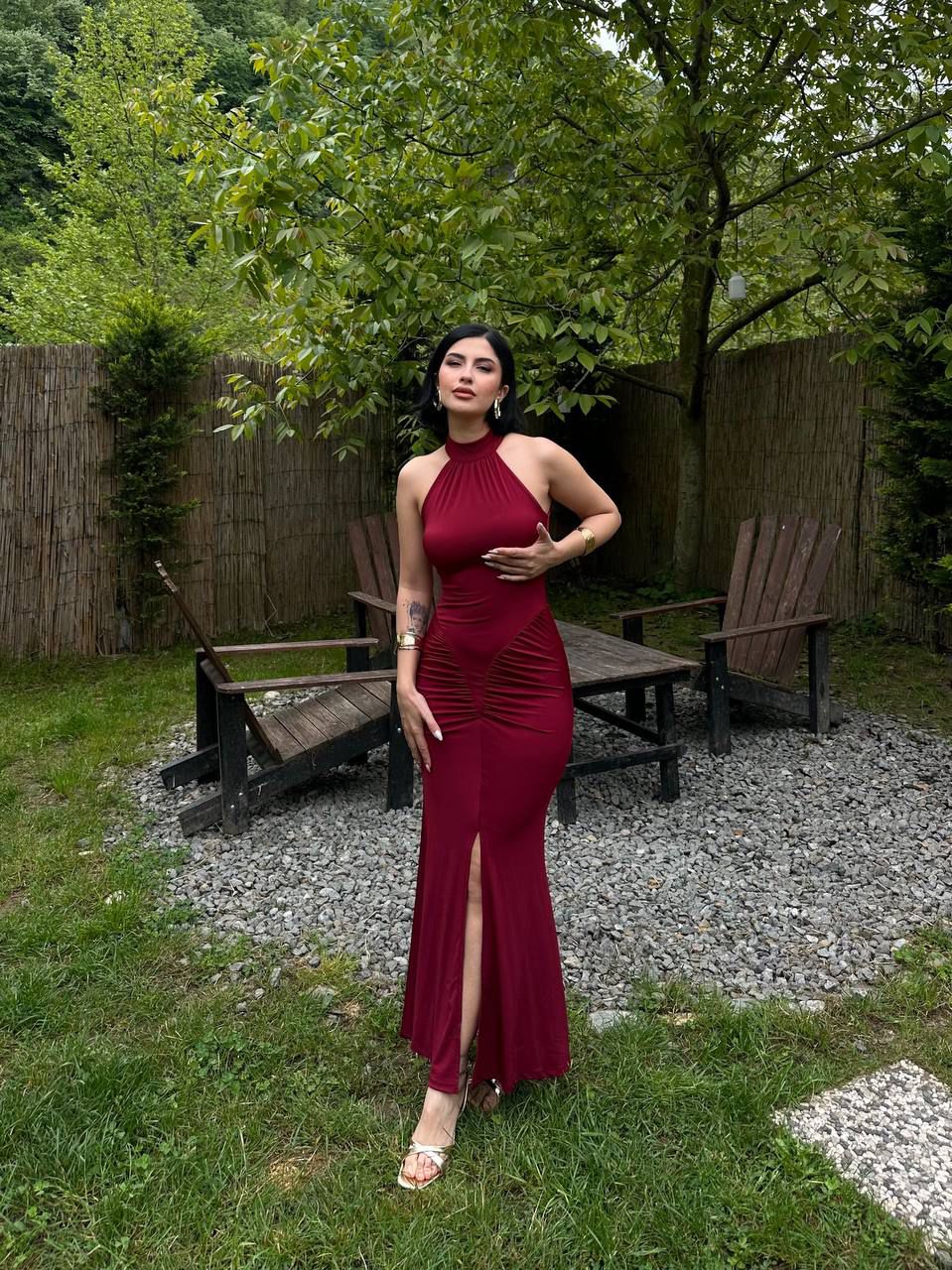 Yüksek yaka, derin yırtmaç ve toparlayıcı dokusuyla minimal ama çarpıcı.