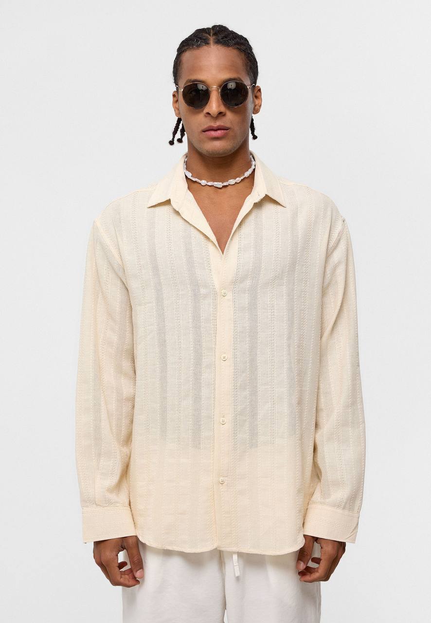 Oversize Şerit Detaylı Erkek Krem Gömlek EOL-15525